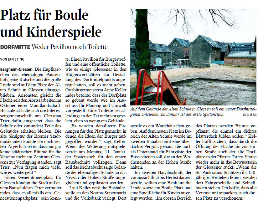 Kommentar: Dorfplatzgestaltung - zu welchem Preis ? Zu der Dorfplatzgestaltung ist eigentlich schon alles gesagt (Formen der Demokratie, gesteuerte Bürgerwerkstätten, fehlende Finanzierung). Der Preis für politische Prestigeobjekte wird doch nun für die Bürgerinnen und Bürger wahr: es geht nur mit Steuererhöhungen, die wir jetzt alle in Bergheim zu tragen haben, nämlich happige 10% mehr. Dafür können sich dann unsere Kommunalpolitiker "feiern" lassen, die mal gerade wieder für fünf Jahre gewählt worden sind. Von Steuererhöhungen war aber in den vielen bunten Flyern der Parteien keine Rede. Auch in den bunten Broschüren der Bürgermeisterin Pfordt war davon nichts zu lesen. Einmal mehr sind wir wieder hinter das Licht geführt worden. Die neue CDU Ortsvorsteherin Keller kann sich prima hinter ihrem CDU-Fraktionschef Hübner verstecken und wir Bürgerinnen und Bürger können dann mit dem angekündigten Heulen und Zähneklappern beginnen. Prima Einstieg ins Neue Jahr 2010. Herzlichen Dank an die Bergheimer CDU und Bündnispartner.