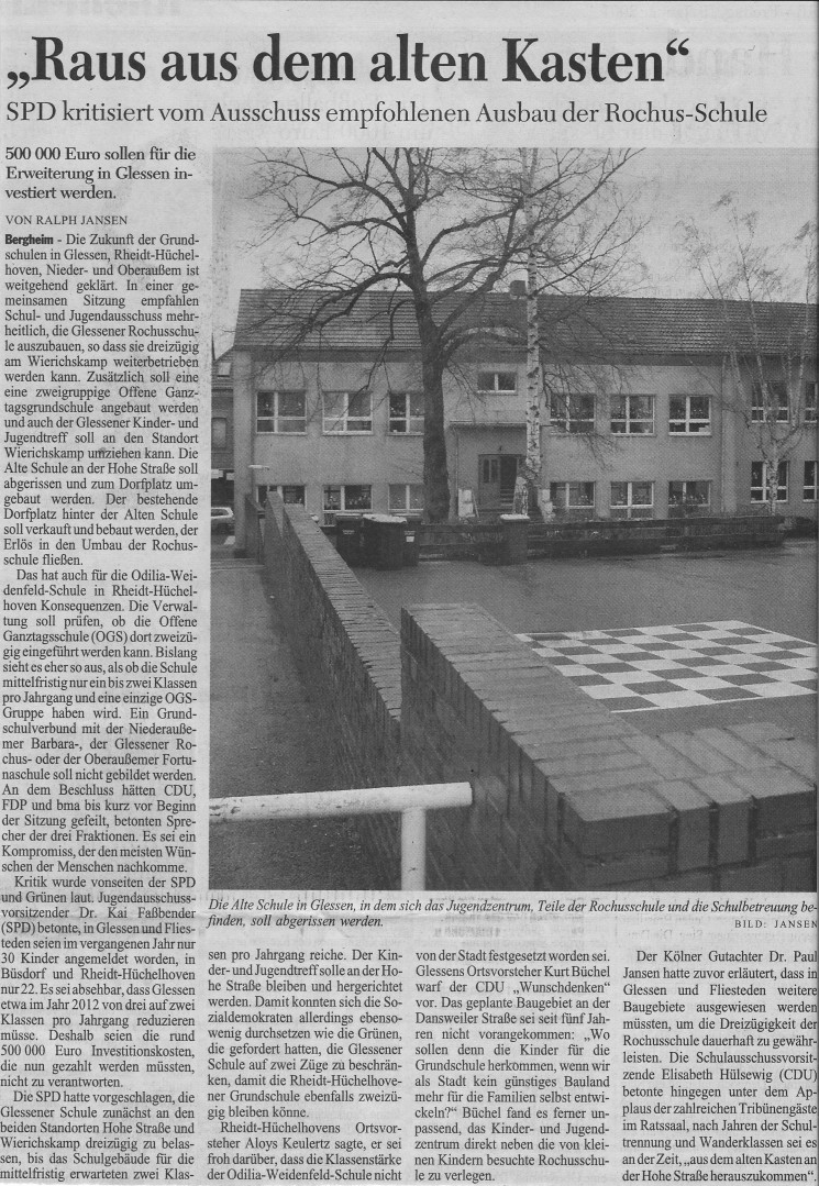 In der Sitzung der Ausschüsse für Schule und Weiterbildung sowie für Kinder Jugend und Familie steht am 17.01.2007 als TOP 2 die Entwicklung der KGS Rochusschule sowie Neubau des Jugendtreffs zur Beratung an. Die Hintergründe und Kommentar folgen in Kürze.
